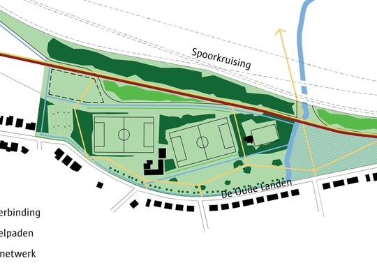 Tussen de spoorwegberm en de woonwijk Oude Landen komt een recreatief buurtsportpark. De huidige voetbalvelden blijven behouden en worden aangevuld met enkele buursportveldjes. Er wordt ook nagegaan of het verplaatsen van de parking kan zorgen voor een betere verbinding tussen de woonwijk en de huidige sportvelden. Een stelsel van grachten en de mogelijkheid tot 2 nieuwe bufferzones zorgen ervoor dat het water voldoende ruimte heeft om langzaam in de ondergrond te trekken. De juiste ligging van deze waterbuffers wordt opgenomen bij de verdere uitwerking van het conceptplan.