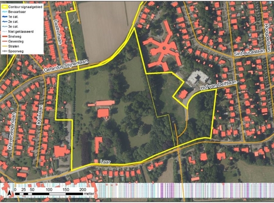 We adviseerden dat de volledige zone rond het oude Laarhof (westelijk deel binnen de gele lijnen op de afbeelding) niet meer bebouwd mag worden. Het oostelijk deel (rondom het kasteeltje) kan onder voorwaarden nog bebouwd worden, maar daar moet wel ernstig rekening worden gehouden met waterproblematiek.