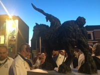 Voor het tienjarig bestaan van de gansrijdersvereniging de Lustige Gans gaf het districtsbestuur aan beeldhouwer Raf Thys uit Kalmthout de opdracht een standbeeld te ontwerpen. Vrijdagavond werd onder grote belangstelling het beeld in de Driehoekstraat onthuld.