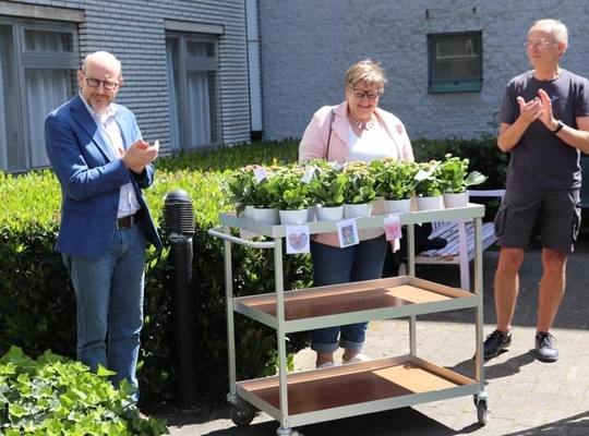 In het weekend van 9 en 10 mei ging de uitdaging van start. De lopers waren vrij dat weekend om te lopen wanneer, waar en hoe lang ze wilden en konden hun kilometers dan laten registreren. Meerdere mensen van ons Ekers N-VA bestuur liepen mee. Niet minder dan 317 lopers hebben dat weekend de ongelooflijke afstand van 3445,72km bij elkaar gelopen. Onze Ekerse sportievelingen hebben hun uitdaging zeker gewonnen. De verdiende 2180 euro gaat richting Kom op tegen kanker. Het district heeft bij de Ekerse middenstand 700 bloemetjes besteld voor alle bewoners en personeel van onze Ekerse woonzorgcentra. Op 14 mei kwamen de plantjes toe en werden ze uitgedeeld met een kleine plechtigheid aan wzc Hof De Beuken in de aanwezigheid van onze districtsburgemeester Koen Palinckx en districtsschepen Annemie Plompen.