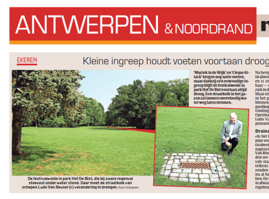 De festivalweide in park Hof De Bist, die bij zware regenval steevast onder water stond. Daar moet de straatkolk van schepen Ludo Van Reusel (N-VA) verandering in brengen.